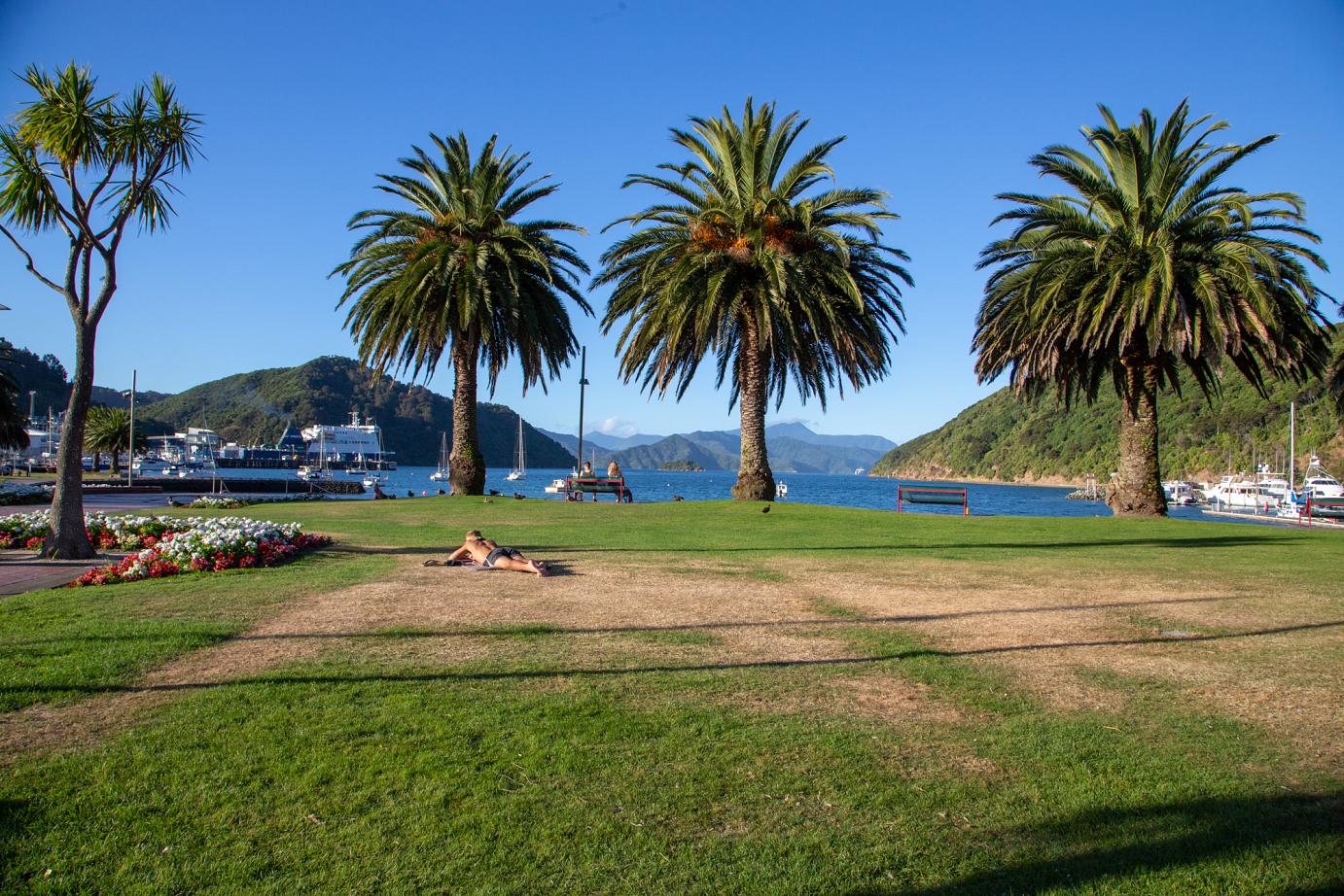 Wir haben uns ein Frühstück geholt und Stephan hat dann wieder rumtelefoniert. Sowohl mit den Campervan-Leuten, als auch mit der Agentur, über die wir gebucht hatten. Ein Austausch, z.B. in Christchurch, war aber leider immer noch nicht möglich, weil Mitte der Hauptsaison. Aber zumindest haben wir eine Werkstatt im kleinen Picton genannt bekommen, die sich um uns kümmern.