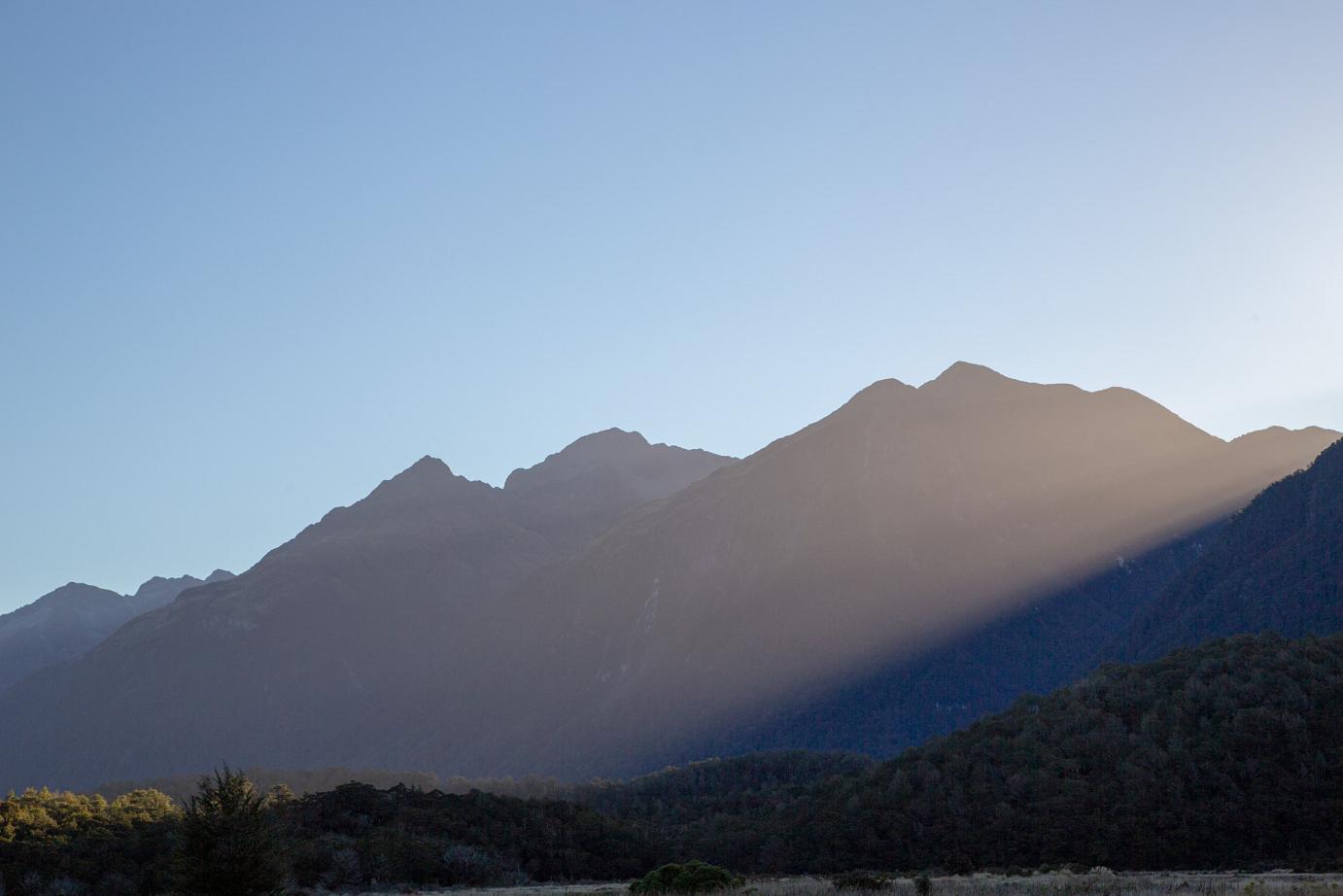 Es waren schon steile Passagen dabei und Graham hat geächzt - aber keiner hinter uns und sogar der Homer-Tunnel war wegen Bauarbeiten auf 30 km/h begrenzt, also alles easy 🙂 Wunderschöne Abendstimmung und die Straße gehörte uns - Queen und King of the Road 🙂