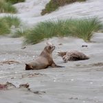 Zuerst haben wir einen Abstecher nach Curio-Bay gemacht. Wir dachten, wir setzen unsere “Pause” dort fort, weil wir ja von Riverton wegmussten. 2007 hatten wir hier eine sehr romantisch, verregnete Übernachtung auf dem dortigen Campingplatz, der nach einer etwa 16 km langen Schotterstraße erreichbar war. Es gibt hier u.a. einen versteinerten Wald, den Fossil Forest, bei dem wir damals im Regen spazieren waren.