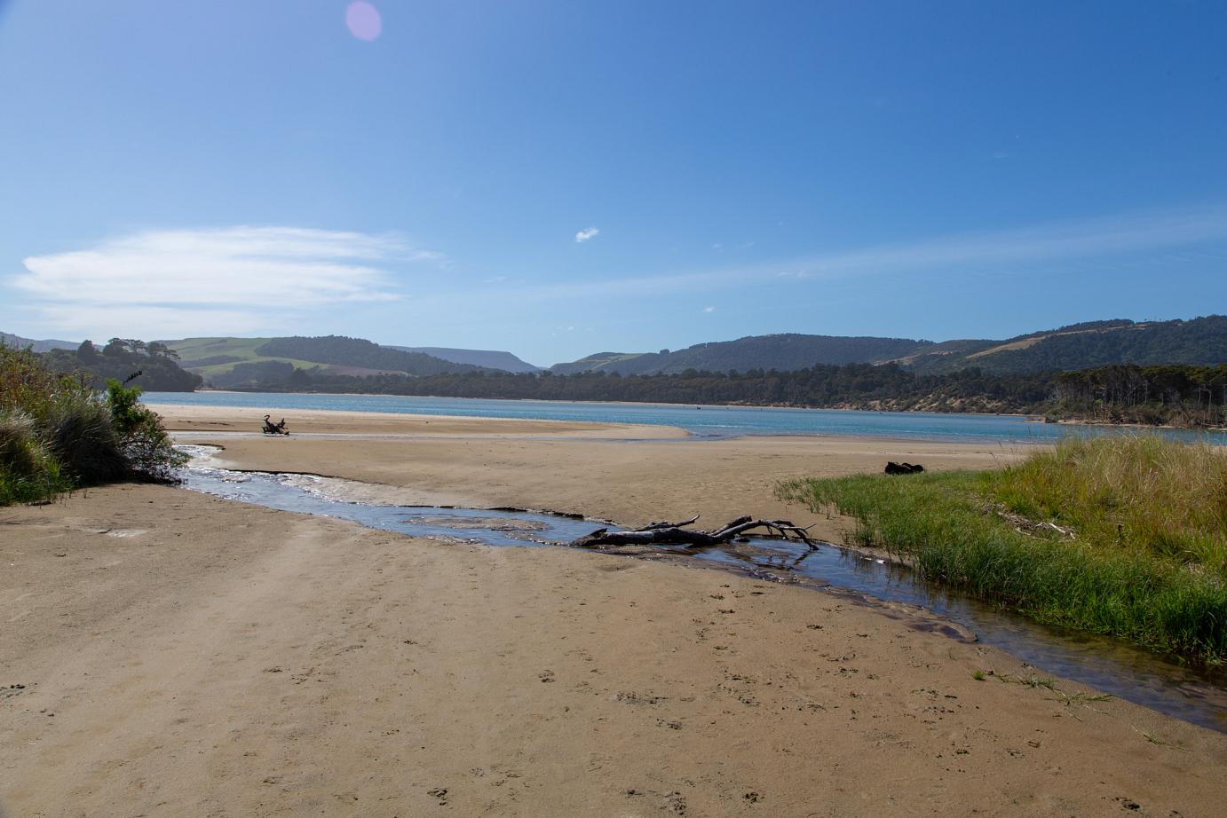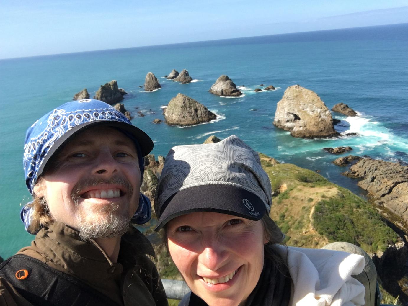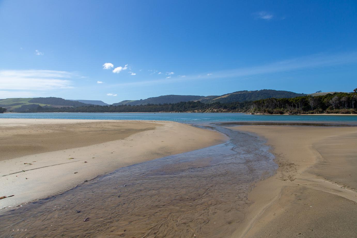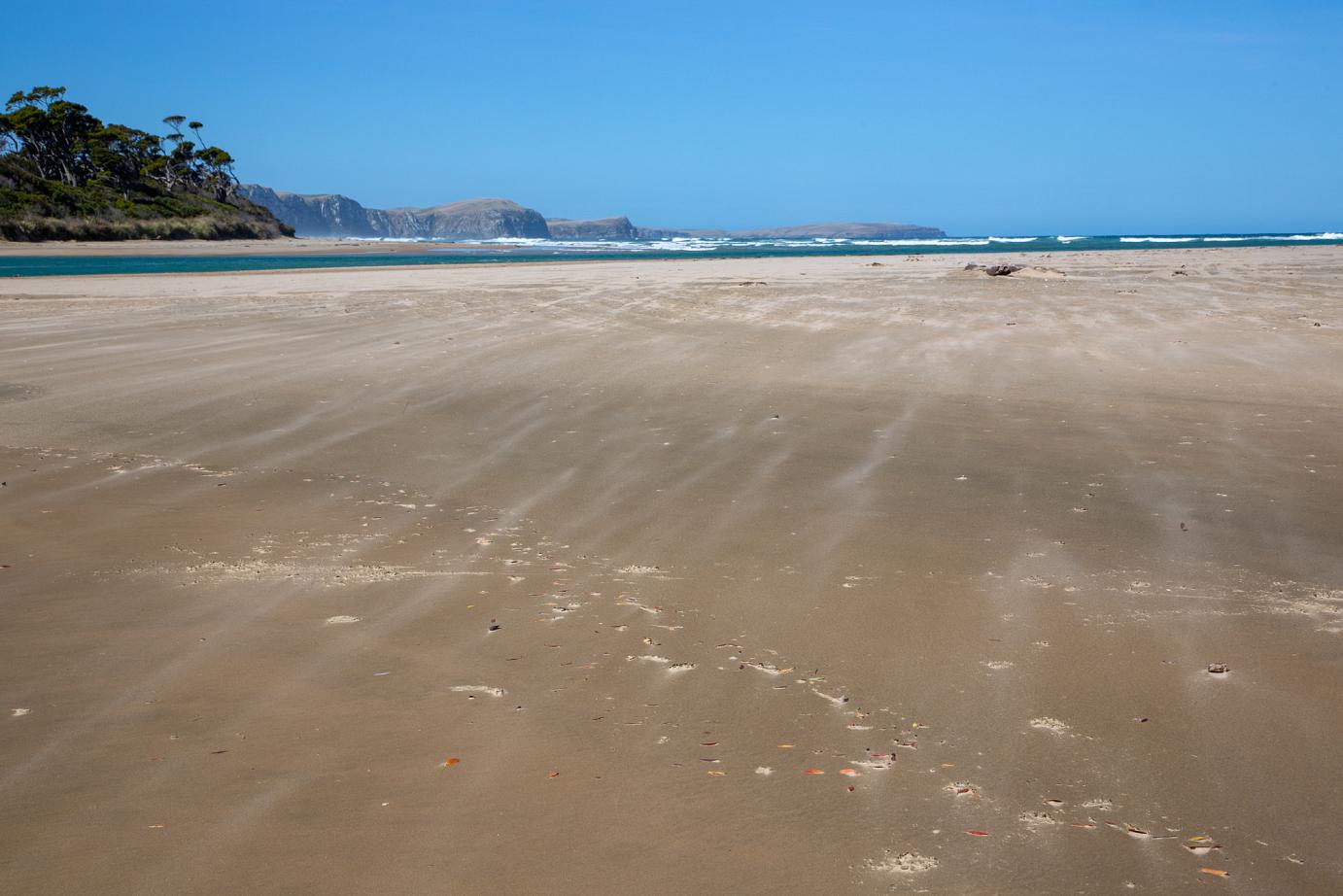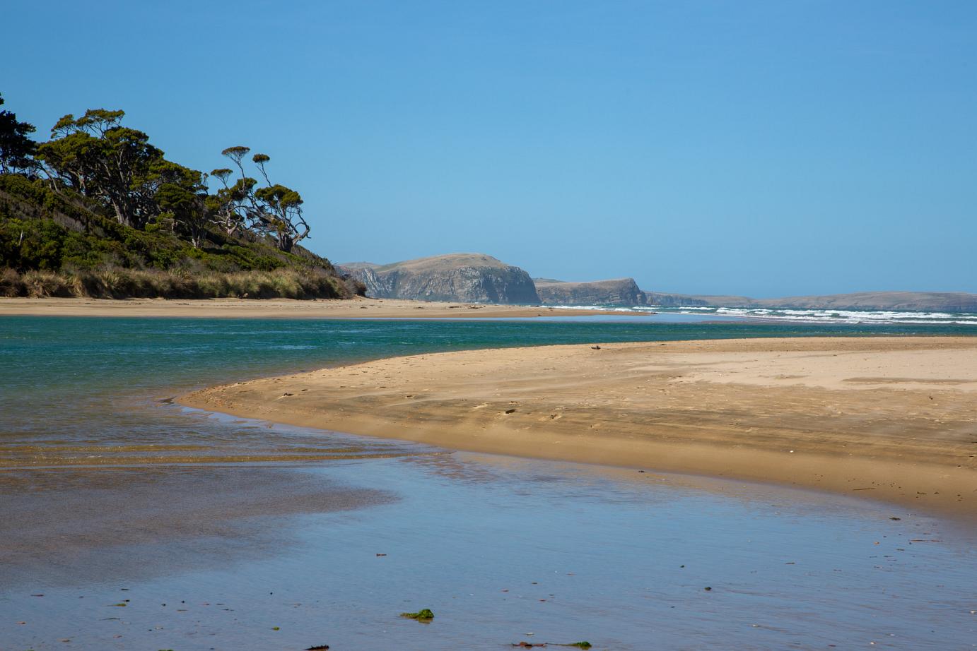 Nach einer einigermaßen guten Freedom-Nacht in einer kleinen Felsbucht sind wir am nächsten Tag mit Traum-Wetter weitergefahren. Per Zufall sind wir zum Tahakopa-Beach eingebogen, wo der gleichnamige Fluss ins Meer fließt – einfach superschön. Weil sie auf dem Weg lagen, haben wir noch die Matai-Falls mitgenommen, ein kleiner Weg, 20 Minuten hin- und zurück. Nett, aber jetzt ist unser Pensum an Wasserfällen auch gedeckt 🙂